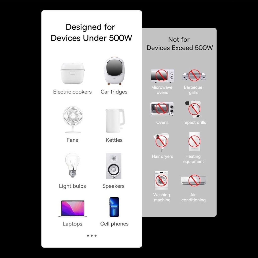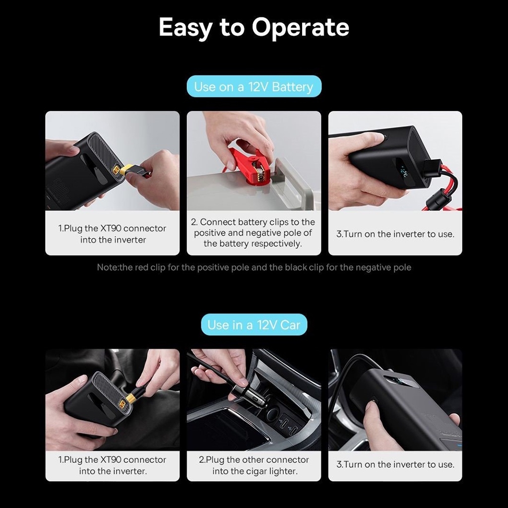 ☑️ Đầu vào được thiết kế thông minh khi vừa có thể cắm trực tiếp vào tẩu sạc trên xe hơi (AC max 150W) hoặc cắm vào bình ác quy của xe (AC max 300W hoặc 500W)