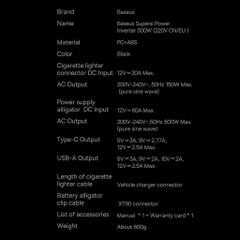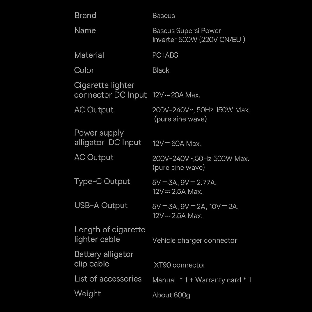 - Tên sản phẩm: Baseus Super Si Power Inverter 500W