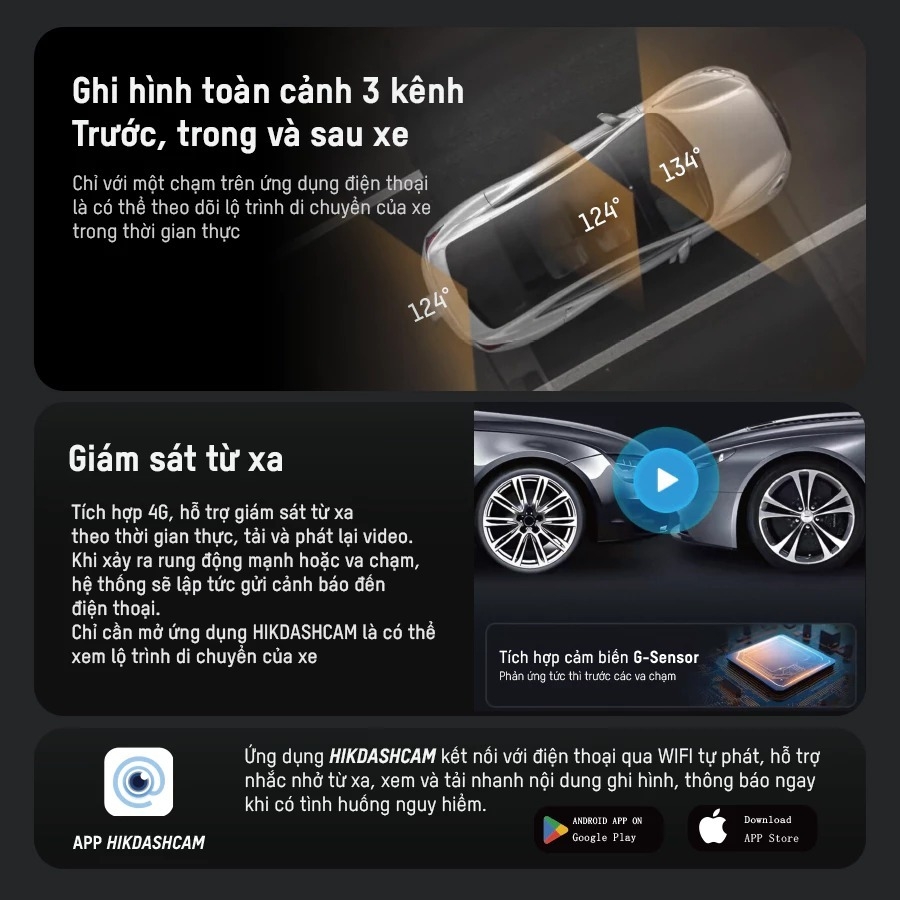- Tính năng: Ghi hình 3 kênh, ADAS nhắc nhở lái xe, cảm biến G-Sensor, chế độ đỗ xe, ..