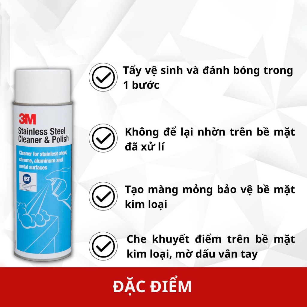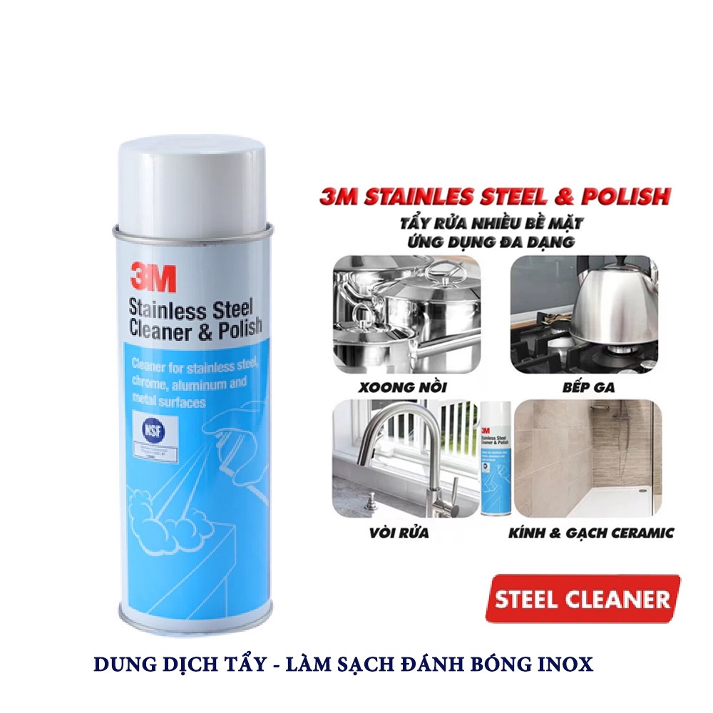 3M Stainless Steel Cleaner & Polish là dung dịch dạng bọt có tính năng thẩm thấu cực nhanh, giúp tẩy rửa rỉ sét và làm cho bề mặt cần được tẩy rửa trở nên sáng bóng.