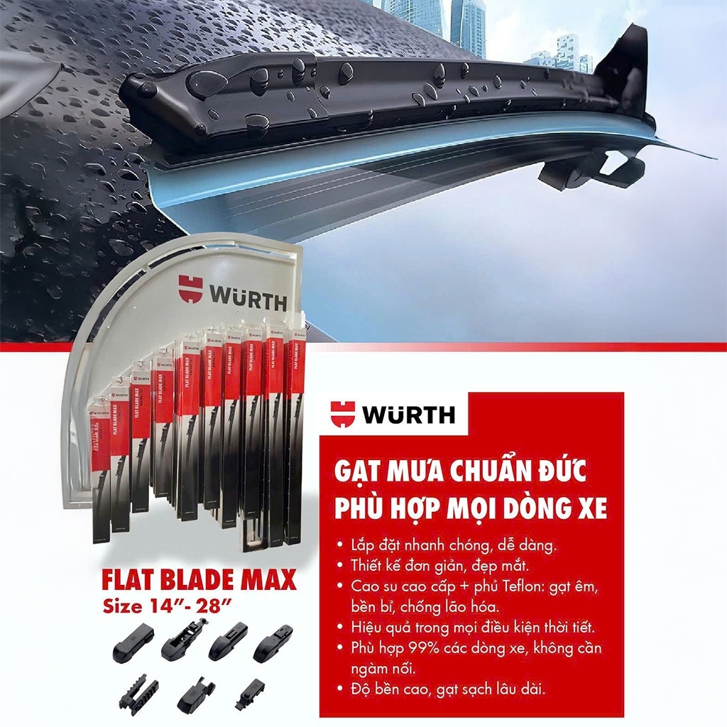 Gạt Mưa Ô Tô WURTH Flat Blade Max Thân Mềm CAO CẤP Hỗ Trợ Thay Ngàm Đa Năng Cho Hầu Hết Dòng Xe Hơi